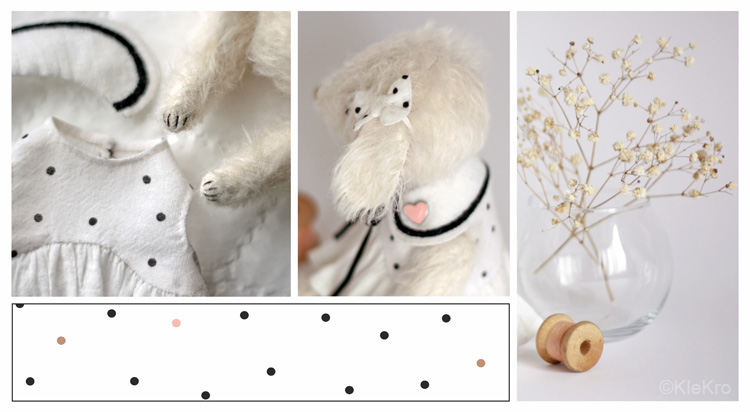 Сшита из мохера, одета в платье цвета белого пиона, воротничок декорирован ручной вышивкой, и дополнен брошью в виде сердца. Набивка опилки, гранулят. Рост 21см. Подробнее на ЯМ.